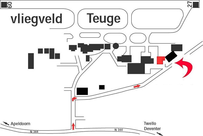 U komt vanaf de Rijksstraatweg (N344) vanuit richting Apeldoorn of richting Deventer en u slaat af bij de afslag VLIEGVELD TEUGE (eerste rode pijl).